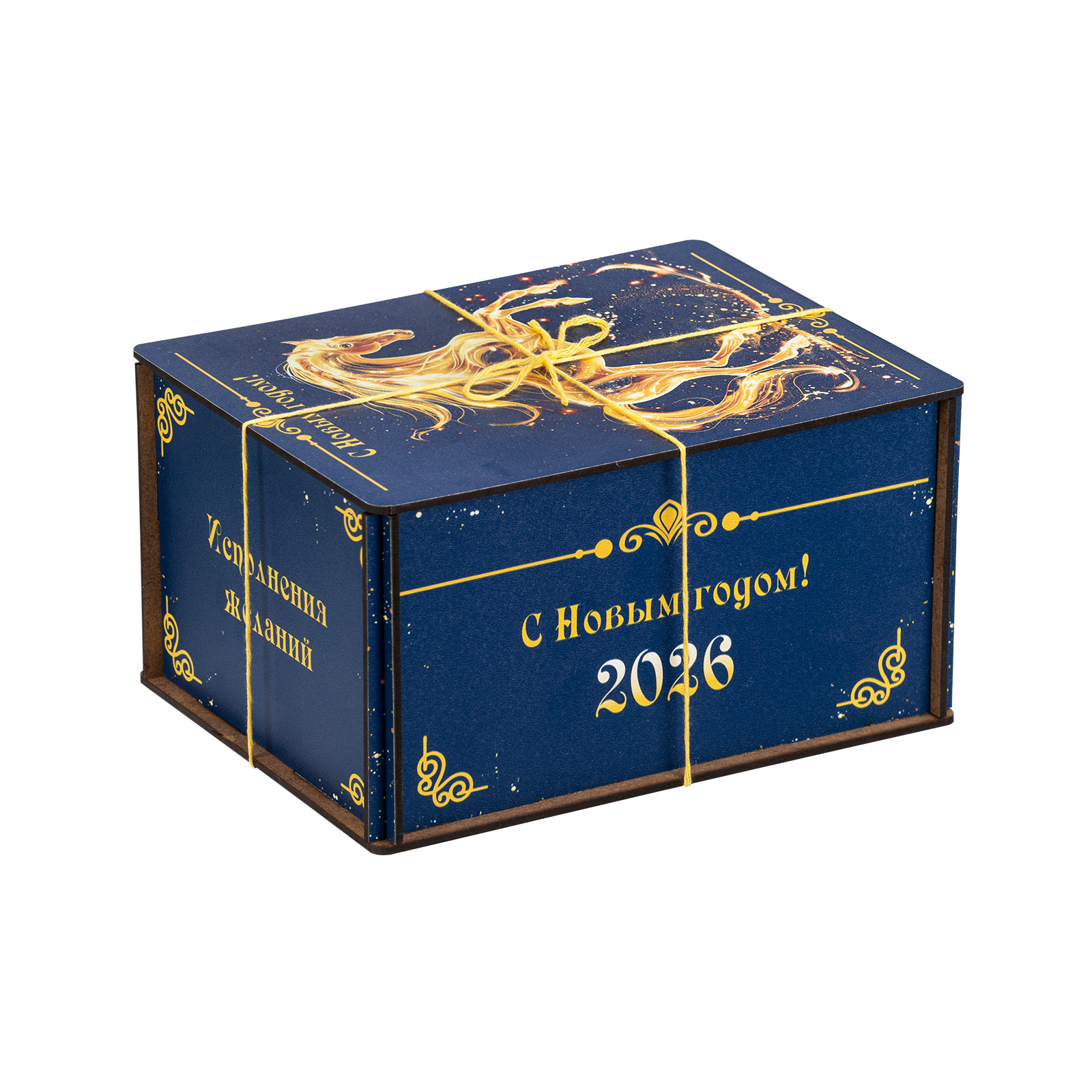 Креативный подарочный набор, который одинаково удачно подойдет как для поздравления подростка, так и для совсем взрослого сластены. Этот подарок представляет собой темно-синий деревянный ящичек, перевязанный контрастной золотой веревочкой. Со всех сторон упаковка украшена поздравительными надписями, а на крышке гордо красуется изображение символа наступающего года - грациозного золотистого коня. В состав подарка входит килограмм самых разнообразных сладостей: батончики, суфле, шоколадные конфеты с начинками на любой вкус - а также небольшой памятный сувенир в виде символа года. Этот подарок можно вручить как на новогоднем мероприятии в школе, так и на корпоративе в крупной компании. Такой презент уж точно придется по душе!