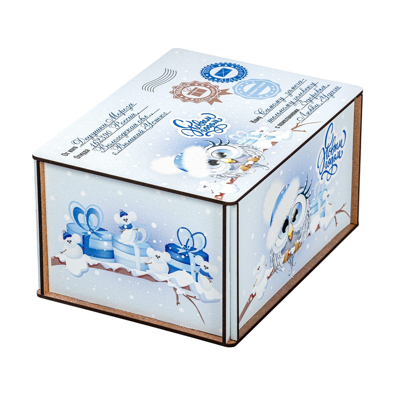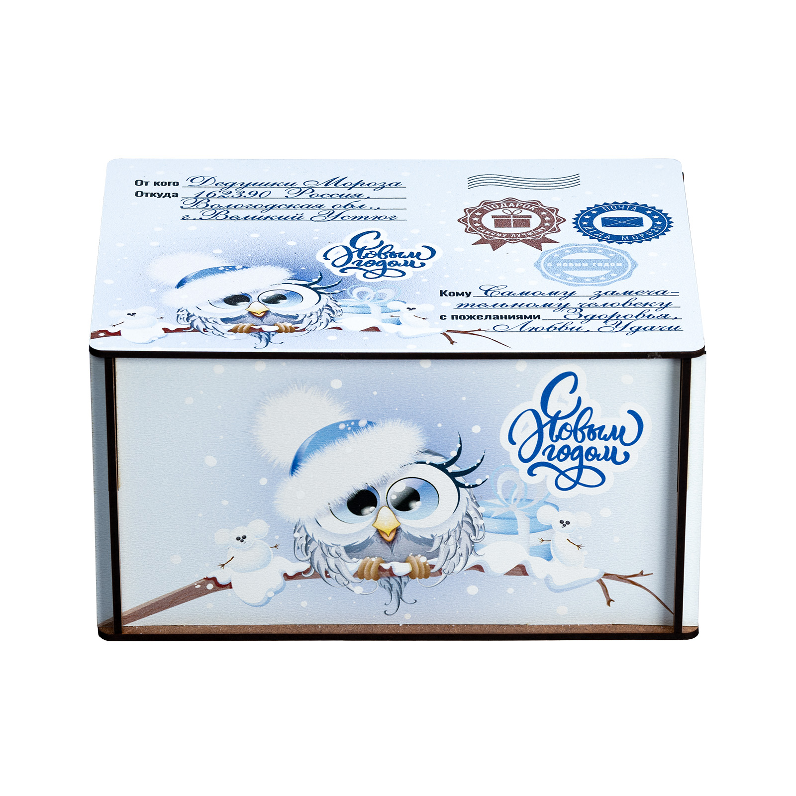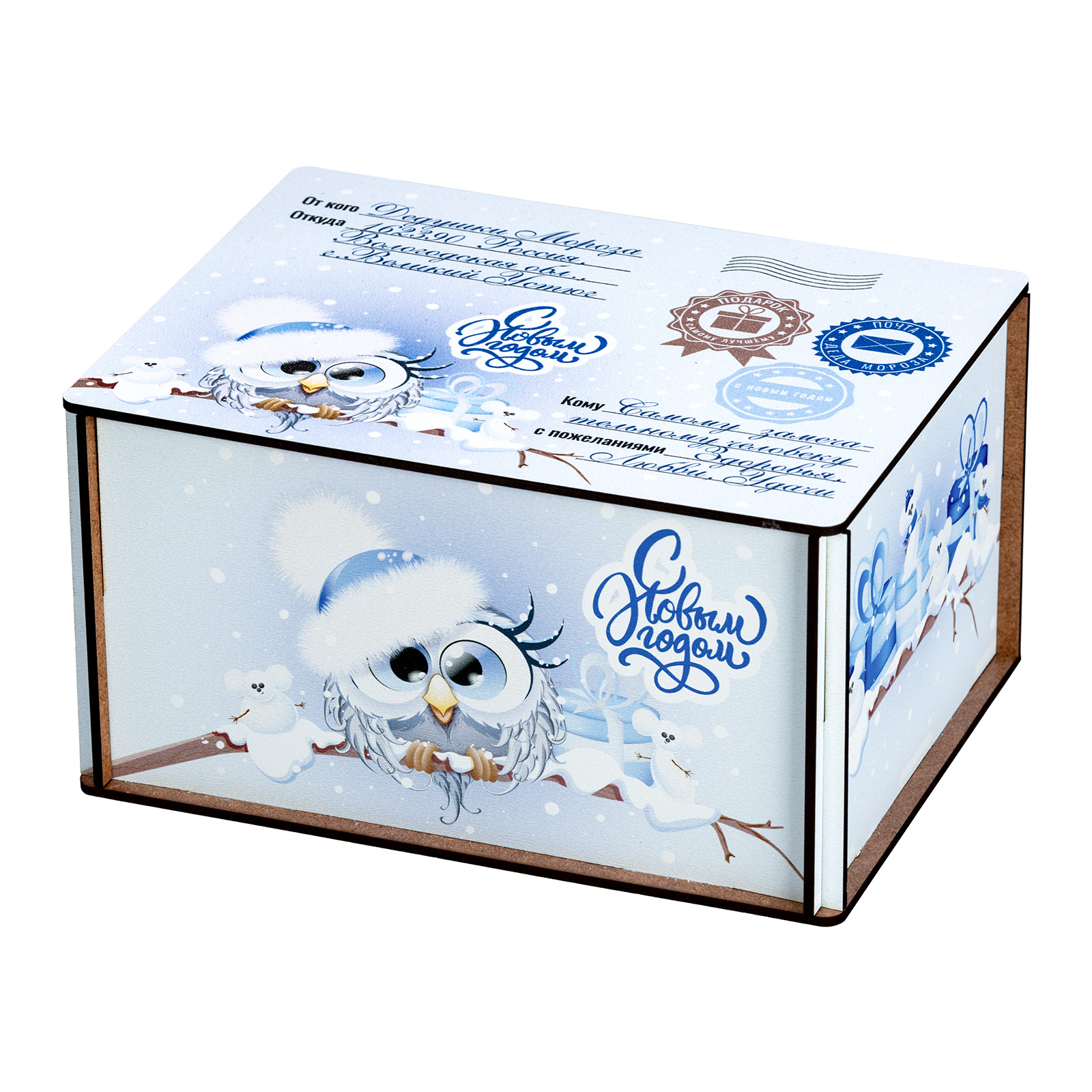 Новогодние сладкие подарки в виде небольшого деревянного ящика - это прекрасный вариант презента для взрослого сластены. Ведь таким образом можно даже самого строгого и делового человека на миг перенести в светлое и беззаботное детство. Набор “Совушки” - это небольшая деревянная бандероль нежно-голубого цвета, украшенная со всех сторон рисунками с очаровательными совятами в милых зимних шапочках. Крышка этой бандероли оформлена под самую настоящую посылку: там указан и отправитель, и получатель, и даже все печати на месте! А что же внутри посылки? Там находятся вкусные и разнообразные сладости, с которыми любое чаепитие в новогодние праздники станет самым настоящим сказочным торжеством!