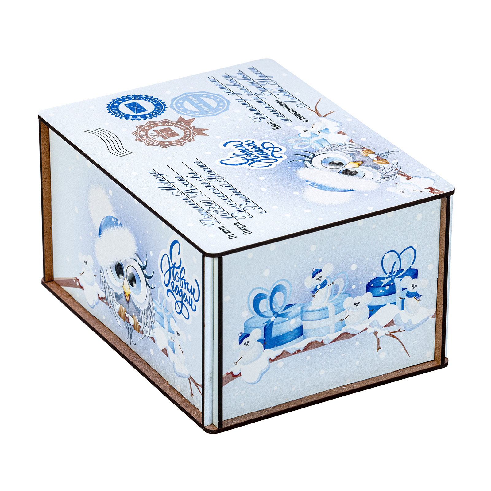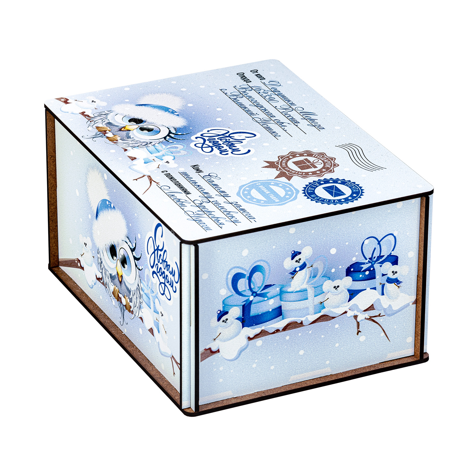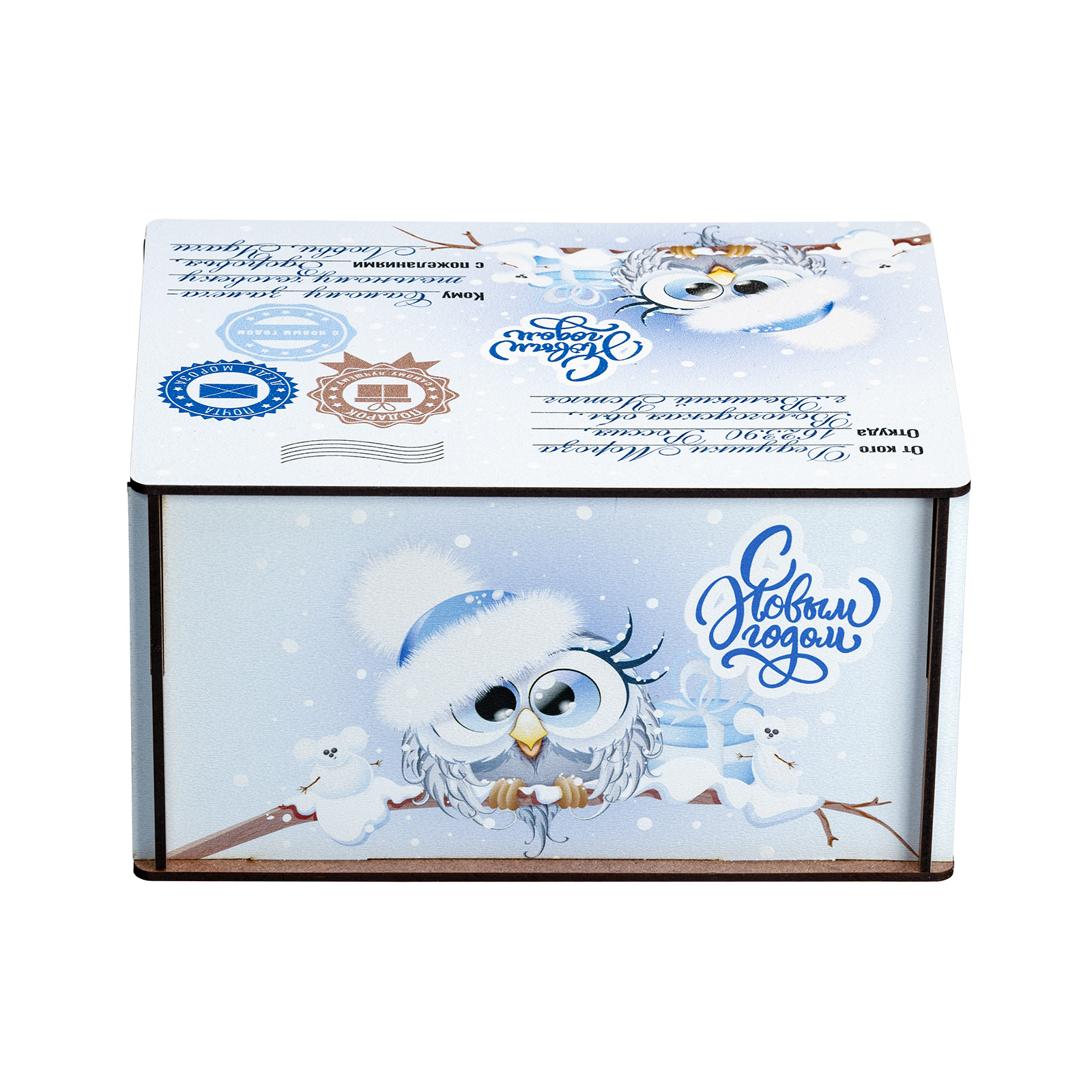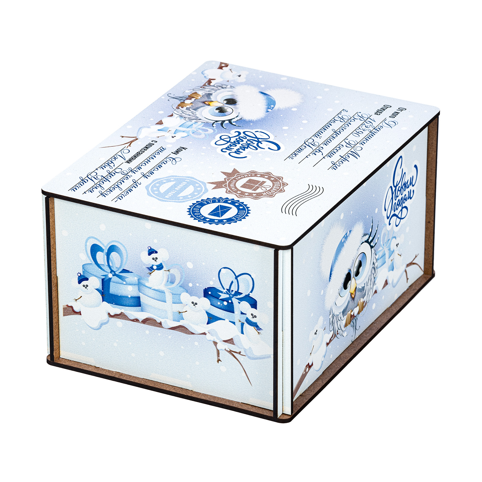 Новогодние сладкие подарки в виде небольшого деревянного ящика - это прекрасный вариант презента для взрослого сластены. Ведь таким образом можно даже самого строгого и делового человека на миг перенести в светлое и беззаботное детство. Набор “Совушки” - это небольшая деревянная бандероль нежно-голубого цвета, украшенная со всех сторон рисунками с очаровательными совятами в милых зимних шапочках. Крышка этой бандероли оформлена под самую настоящую посылку: там указан и отправитель, и получатель, и даже все печати на месте! А что же внутри посылки? Там находятся вкусные и разнообразные сладости, с которыми любое чаепитие в новогодние праздники станет самым настоящим сказочным торжеством!