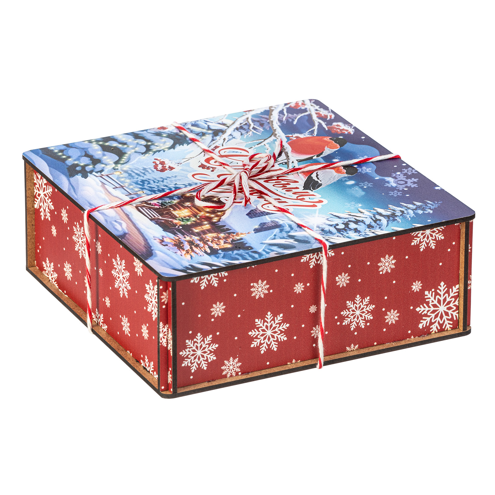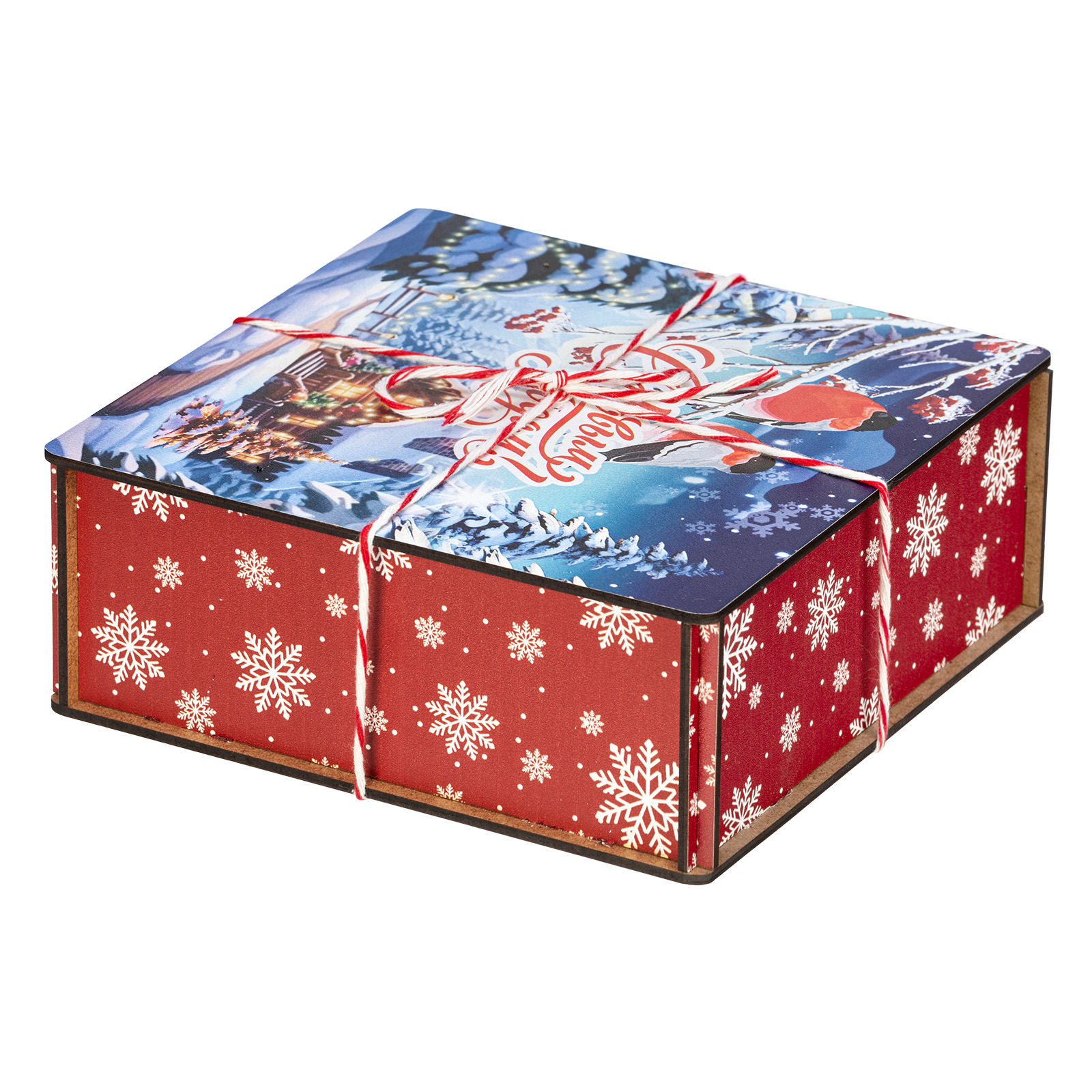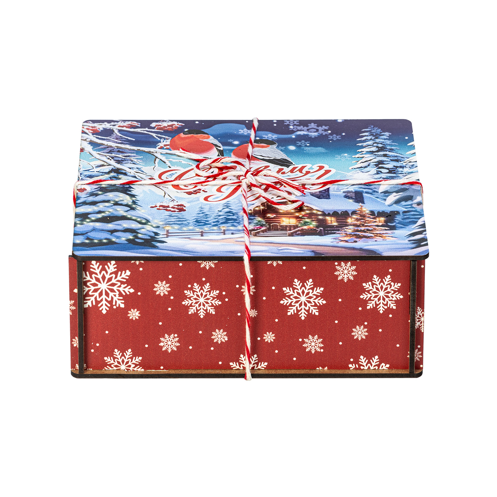 Сладкие подарки в деревянных упаковках - это сочетание оригинальности и безупречного вкуса сладостей. Набор “Январские птицы” идеально подходит в качестве презента сластене любого возраста. Это деревянный ящичек размером 18х18х7, перетянутый праздничной веревкой-шнурком. На крышке ящика изображена завораживающая иллюстрация в виде заснеженной зимней деревни, а на переднем плане красуются главные герои - красногрудые красавцы-снегири, гордо сидящие на еловой веточке. В состав подарка входит 600 грамм вкусных разнообразных сладостей от ведущих кондитерских предприятий страны, а также небольшой памятный сувенир, который еще долго будет сохранять в себе атмосферу новогодних праздников.