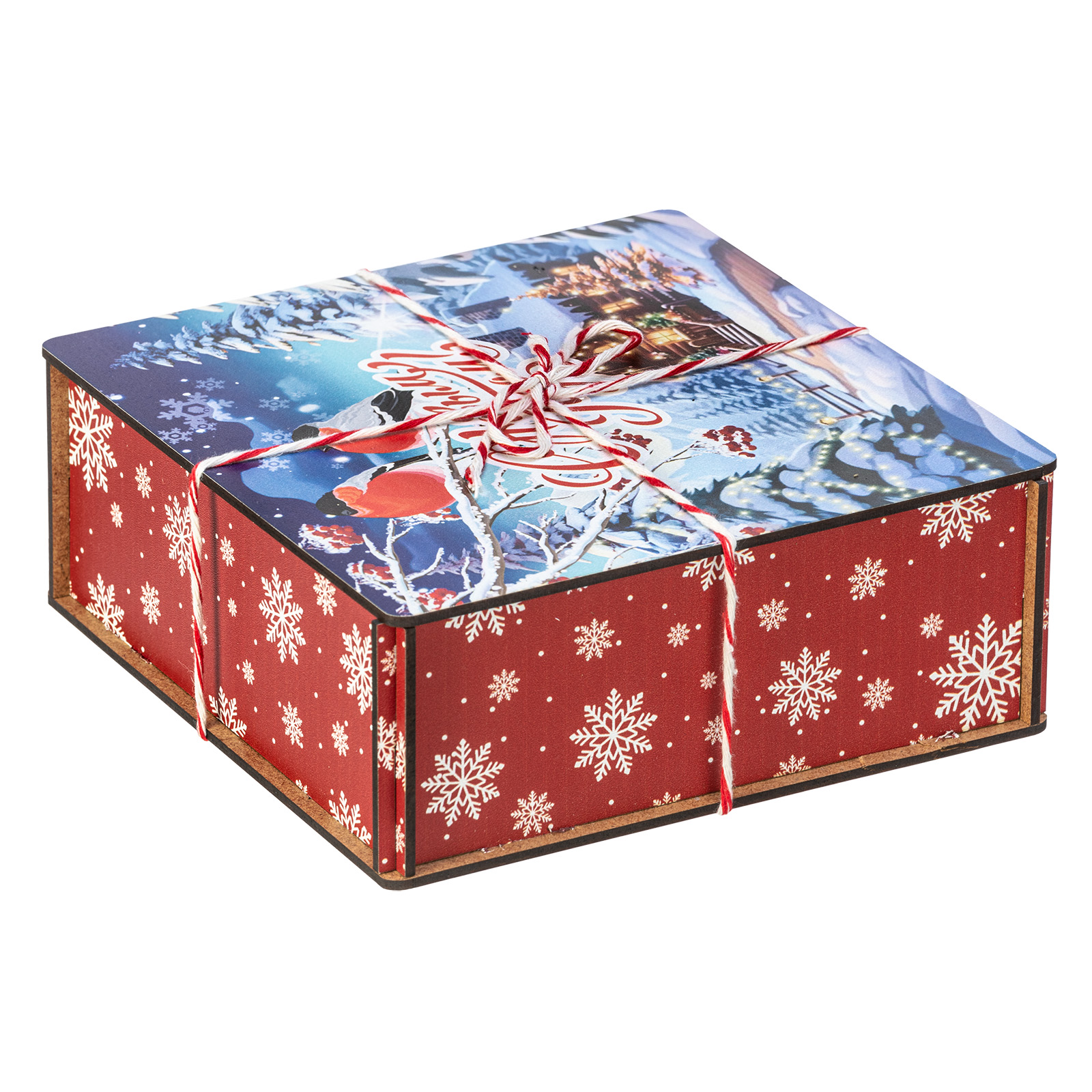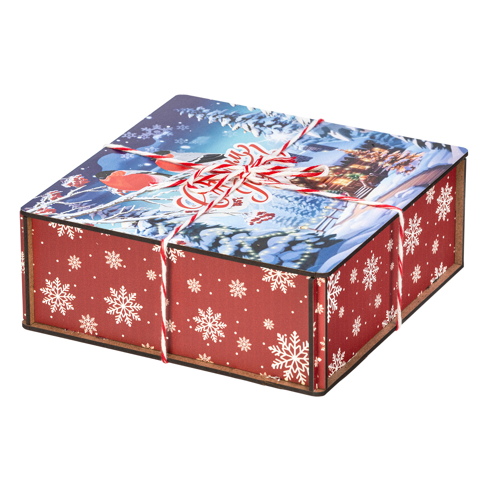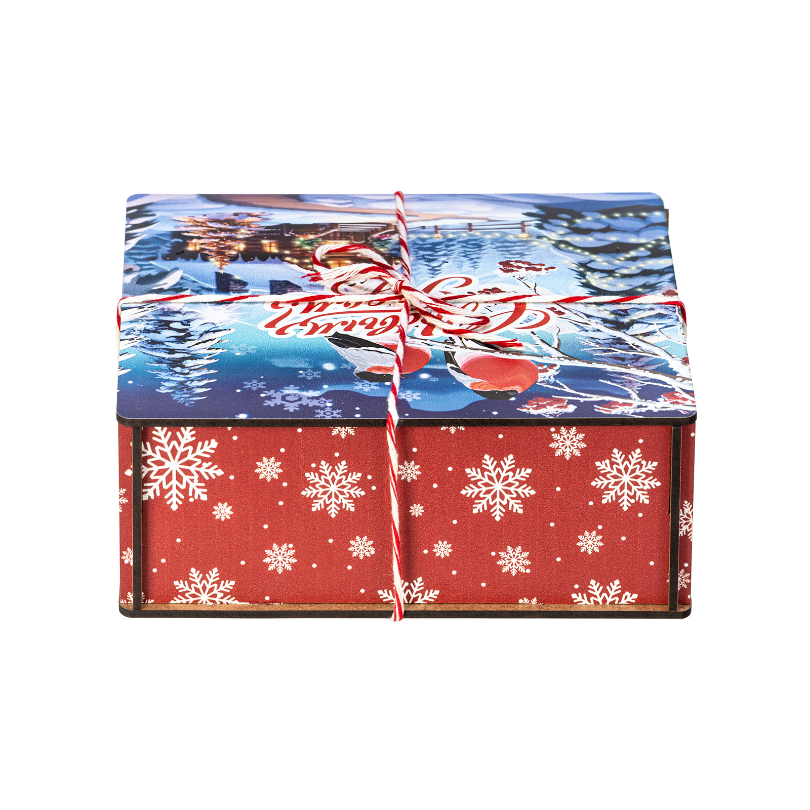 Сладкие подарки в деревянных упаковках - это сочетание оригинальности и безупречного вкуса сладостей. Набор “Январские птицы” идеально подходит в качестве презента сластене любого возраста. Это деревянный ящичек размером 18х18х7, перетянутый праздничной веревкой-шнурком. На крышке ящика изображена завораживающая иллюстрация в виде заснеженной зимней деревни, а на переднем плане красуются главные герои - красногрудые красавцы-снегири, гордо сидящие на еловой веточке. В состав подарка входит 600 грамм вкусных разнообразных сладостей от ведущих кондитерских предприятий страны, а также небольшой памятный сувенир, который еще долго будет сохранять в себе атмосферу новогодних праздников.