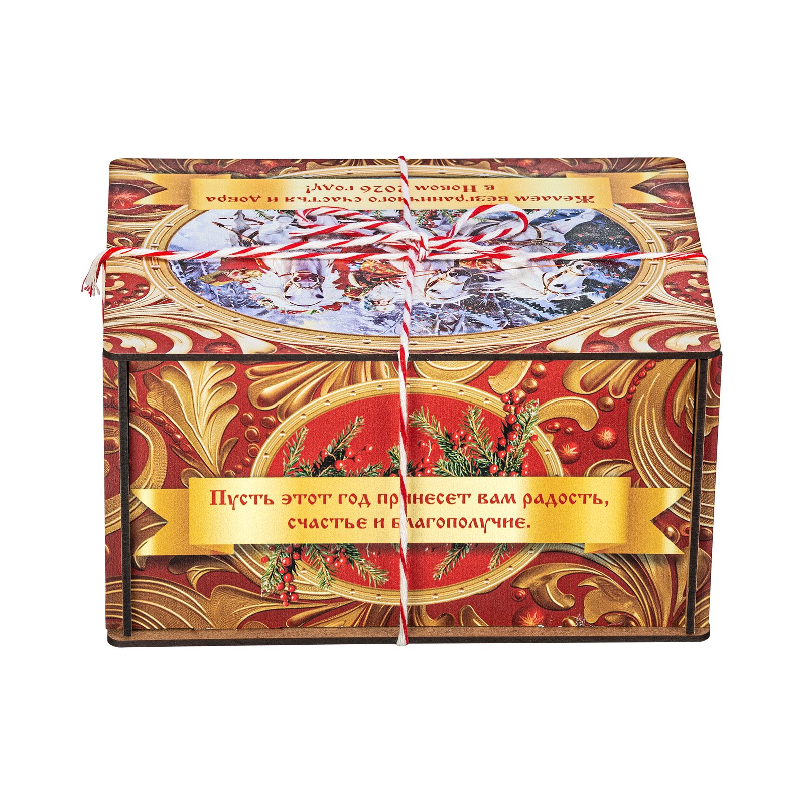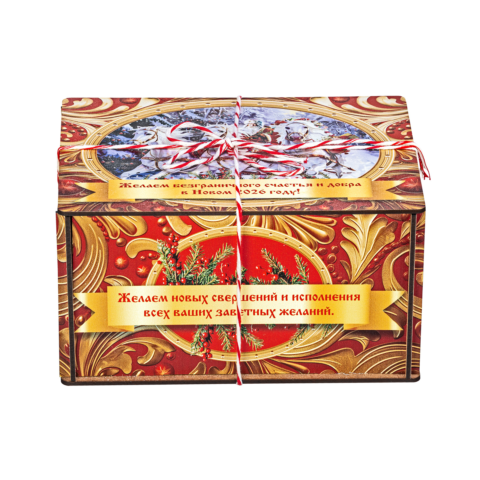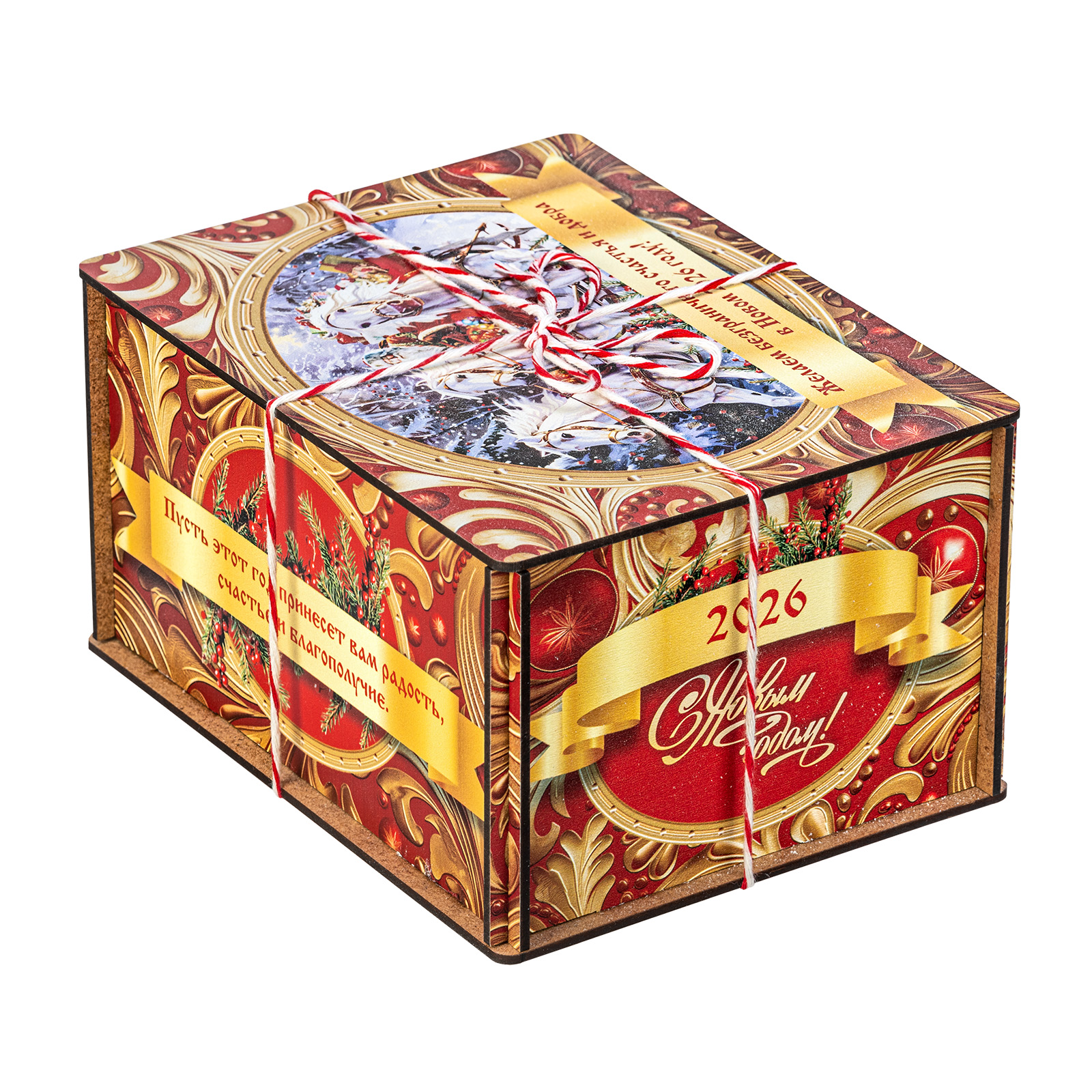 Ищете новогодний сладкий подарок подростку или взрослому? Присмотритесь к набору “Золотые узоры” - это оригинальный конфетный набор в яркой упаковке. В подарок входит килограмм вкусных и разнообразных кондитерских изделий от ведущих фабрик, а также небольшой памятный сувенир в виде символа наступающего 2026 года. Сладости бережно упакованы в небольшой деревянный ящик, выполненный в сочетании золотого и красного цветов. На крышке есть небольшая иллюстрация с изображение Дедушки Мороза в упряжке белых грациозных лошадей. Упаковка аккуратно перетянута цветной ручкой шнурком, что еще больше добавляет ей привлекательности.