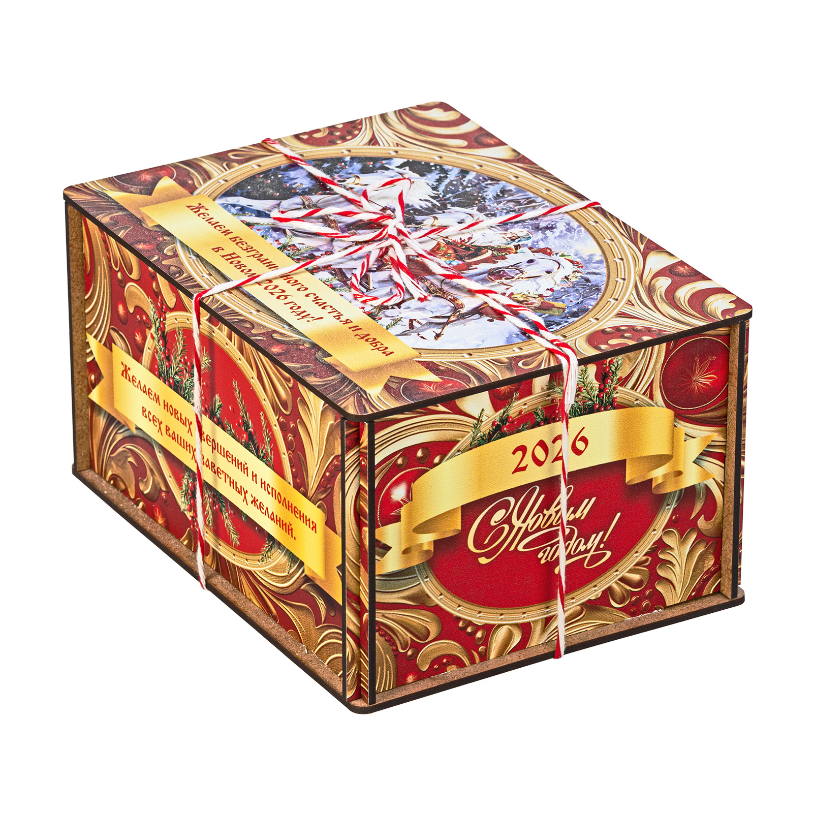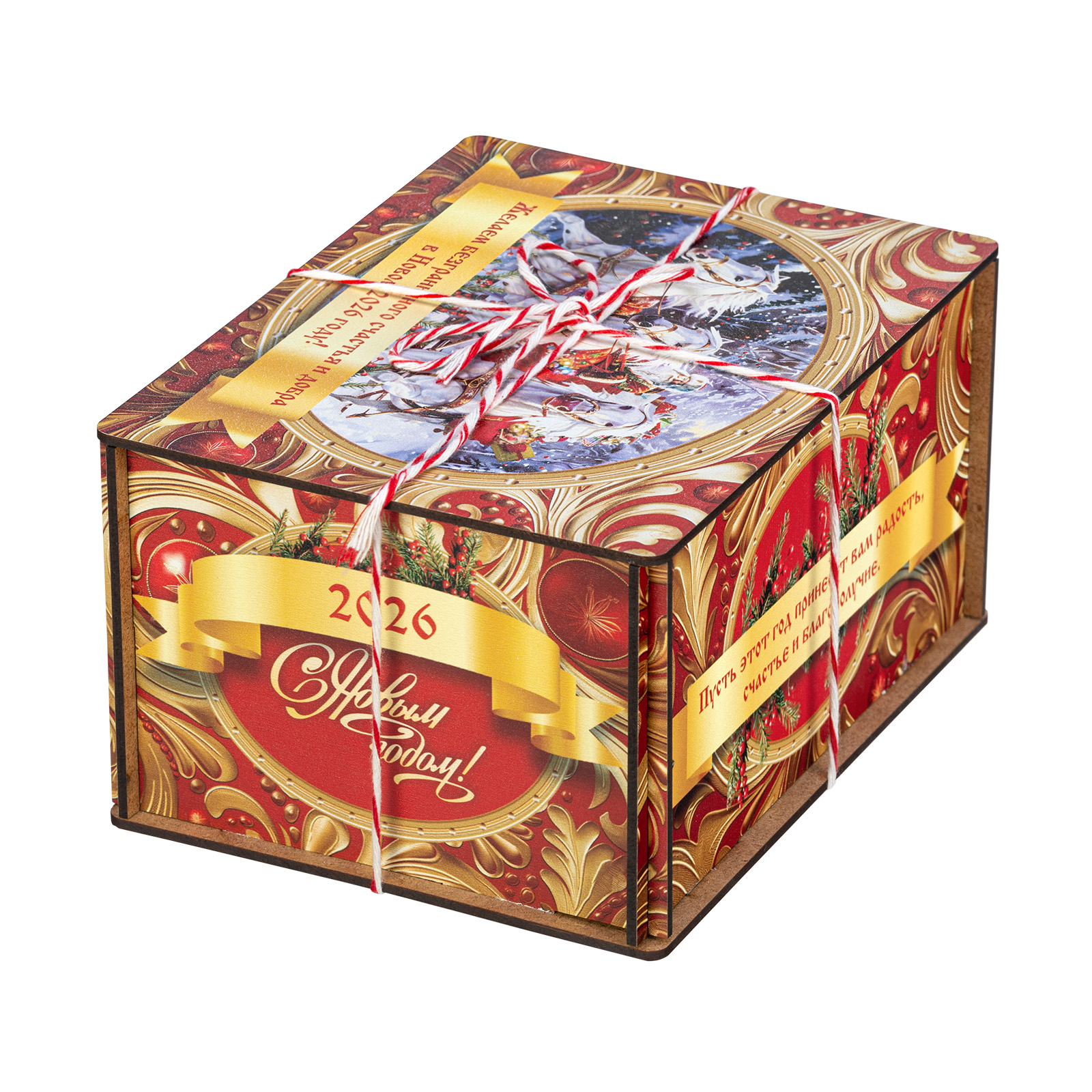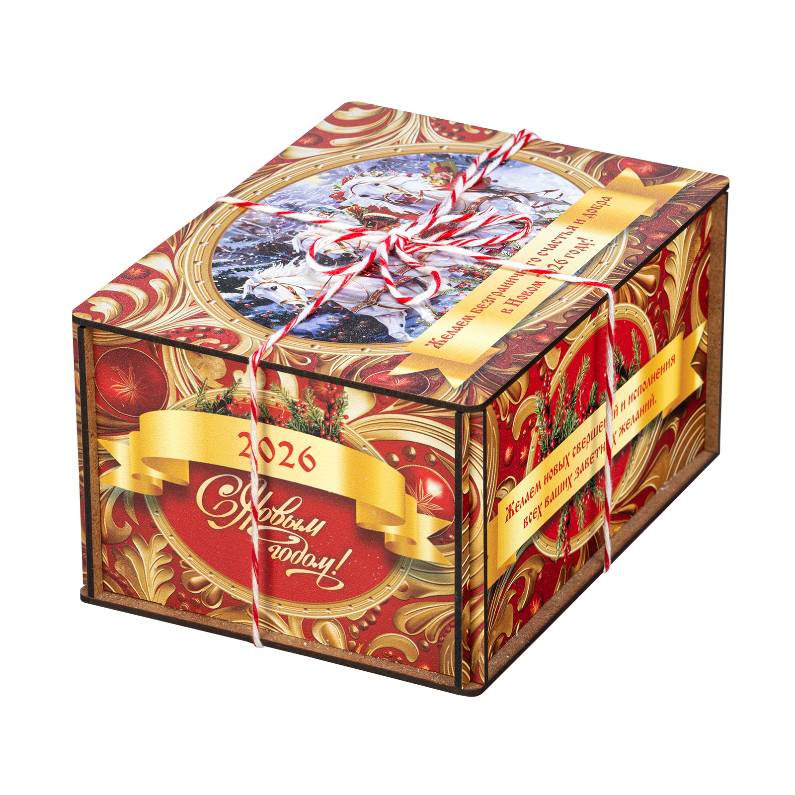 Ищете новогодний сладкий подарок подростку или взрослому? Присмотритесь к набору “Золотые узоры” - это оригинальный конфетный набор в яркой упаковке. В подарок входит килограмм вкусных и разнообразных кондитерских изделий от ведущих фабрик, а также небольшой памятный сувенир в виде символа наступающего 2026 года. Сладости бережно упакованы в небольшой деревянный ящик, выполненный в сочетании золотого и красного цветов. На крышке есть небольшая иллюстрация с изображение Дедушки Мороза в упряжке белых грациозных лошадей. Упаковка аккуратно перетянута цветной ручкой шнурком, что еще больше добавляет ей привлекательности.